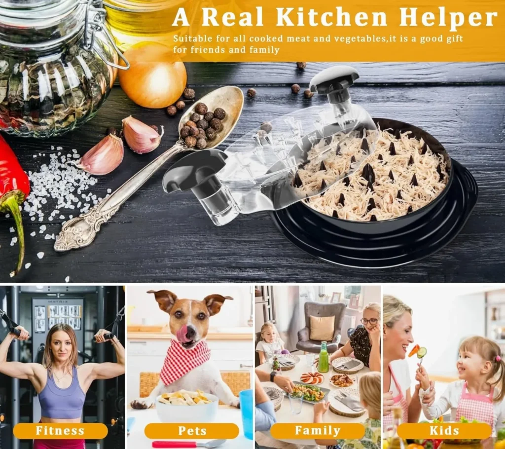 Shred chicken breast, thighs, boneless beef, pork, fish, cooked eggs, veggies like carrots and cabbage, turkey, or goat meat. Compact and light, easy to store. Made from strong food-grade plastic, dishwasher safe.