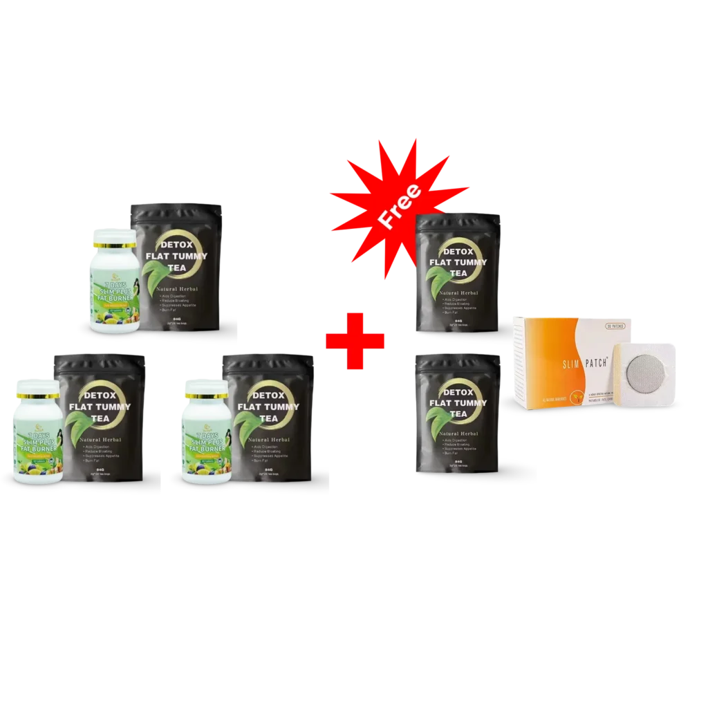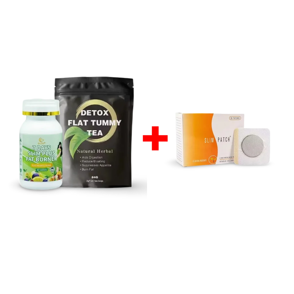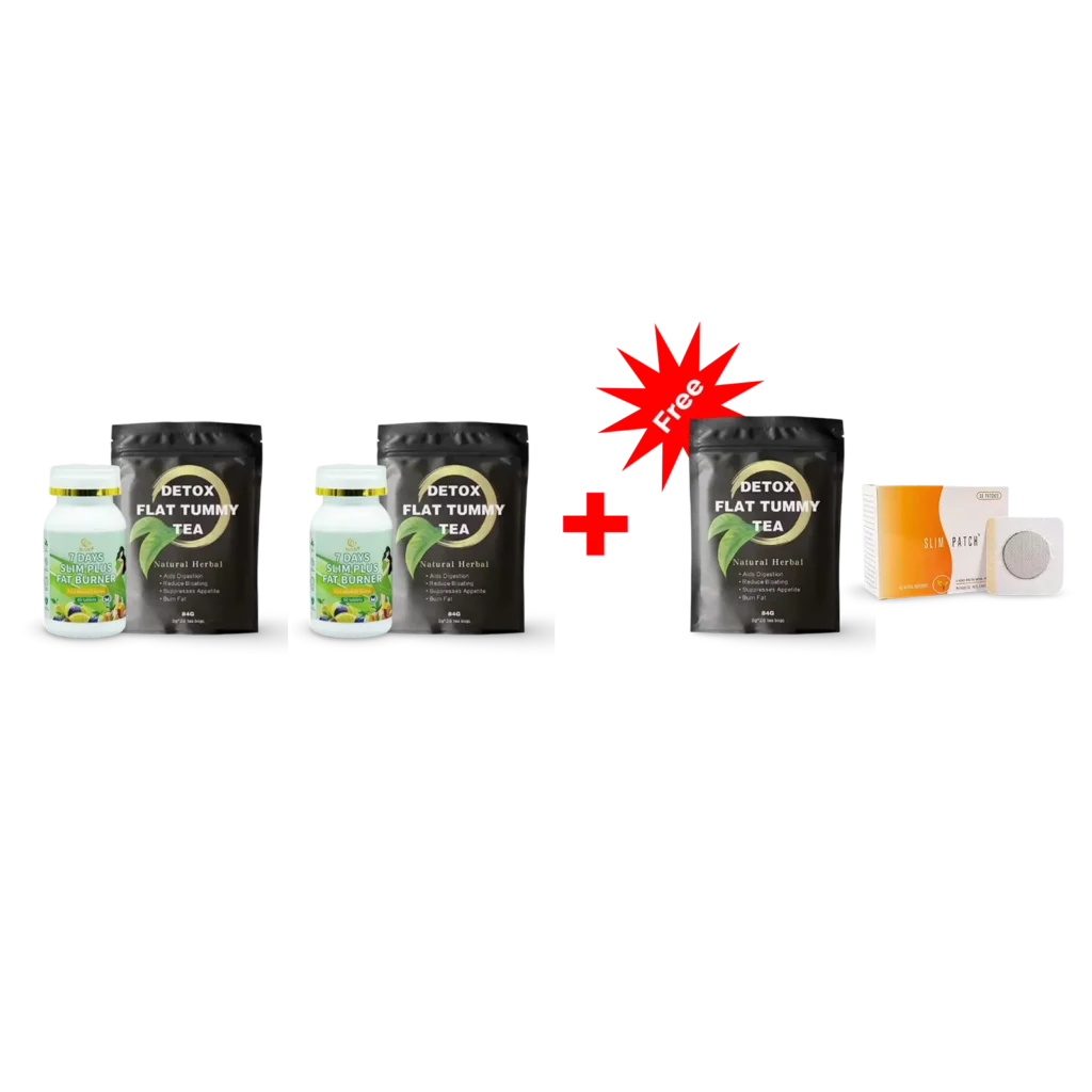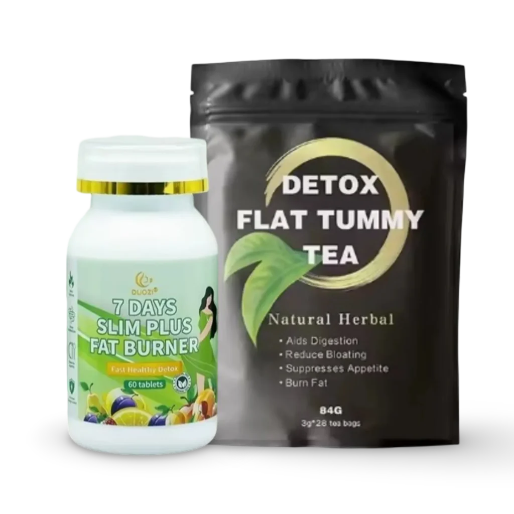 This powerful combo includes two natural products specially made to help you lose weight: 7 Days Fat Burner Capsules and Detox Flat Tummy Tea. Together, they burn calories, reduce bloating, and support your body health naturally.